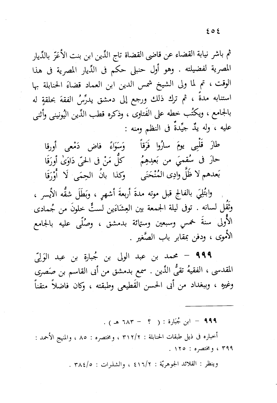 999 - مُحَمَّد بن عبد الْوَلِيّ بن جبارَة بن عبد الْوَلِيّ الْمَقْدِسِي الْفَقِيه تَقِيّ الدّين سمع بِدِمَشْق من أبي الْقَاسِم بن صصرى وَغَيره وببغداد من أبي الْحسن الْقطيعِي وطبقته وَكَانَ فَاضلا متقنا