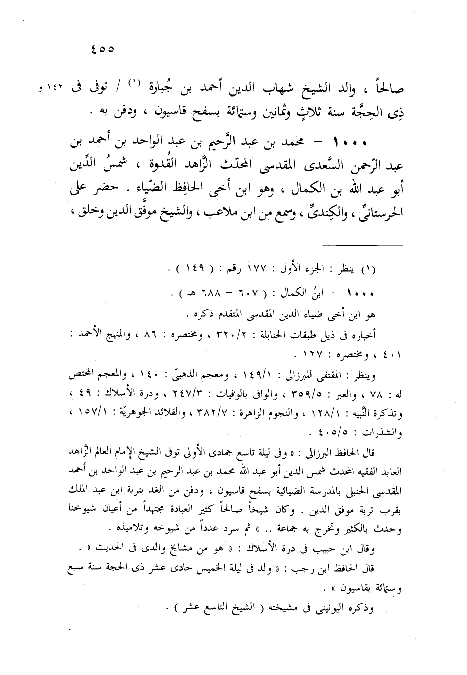 1000 - مُحَمَّد بن عبد الرَّحِيم بن عبد الْوَاحِد بن أَحْمد بن عبد الرَّحْمَن السَّعْدِيّ الْمَقْدِسِي الْمُحدث الزَّاهِد الْقدْوَة شمس الدّين أَبُو عبد الله بن الْكَمَال وَهُوَ ابْن أخي الْحَافِظ الضياء