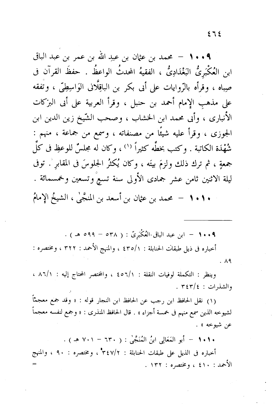 1009 - مُحَمَّد بن عُثْمَان بن عبد الله بن عمر بن عبد الْبَاقِي ابْن العكبري الْبَغْدَادِيّ الْفَقِيه الْمُحدث الْوَاعِظ حفظ الْقُرْآن فِي صباه وقرأه بالروايات على أبي بكر بن الباقلاني الوَاسِطِيّ وتفقه على مَذْهَب الإِمَام أَحْمد بن حَنْبَل وَقَرَأَ الْعَرَبيَّة على أبي البركات الْأَنْبَارِي وَأبي مُحَمَّد ابْن الخشاب وَصَحب الشَّيْخ زين الدّين ابْن الْجَوْزِيّ وَقَرَأَ عَلَيْهِ شَيْئا من مصنفاته وَسمع من جمَاعَة مِنْهُم شهدة الكاتبة