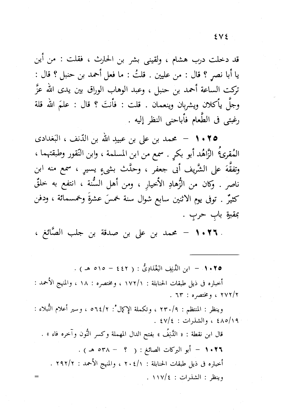 1025 - مُحَمَّد بن عَليّ بن عبيد الله بن الدنف الْبَغْدَادِيّ المقرىء الزَّاهِد أَبُو بكر سمع من ابْن الْمسلمَة وَابْن النقور وطبقتهما وتفقه على الشريف أبي جَعْفَر وَحدث بِشَيْء يسير سمع مِنْهُ ابْن نَاصِر وَكَانَ من الزهاد الأخيار وَمن أهل السّنة انْتفع بِهِ خلق كثير توفّي يَوْم الْإِثْنَيْنِ سَابِع شَوَّال سنة خمس عشرَة وَخَمْسمِائة وَدفن بمقبرة بَاب حَرْب
