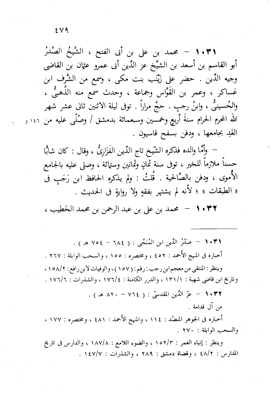 1031 - مُحَمَّد بن عَليّ بن أبي الْفَتْح الشَّيْخ الصَّدْر أَبُو الْقَاسِم بن أسعد بن الشَّيْخ عز الدّين أبي عَمْرو عُثْمَان بن القَاضِي وجيه الدّين حضر على زَيْنَب بنت مكى وَسمع من الشّرف ابْن عَسَاكِر وَعمر بن القواس وَجَمَاعَة وَحدث سمع مِنْهُ الذَّهَبِيّ والحسيني وَابْن رَجَب حج مرَارًا توفّي لَيْلَة الْإِثْنَيْنِ ثَانِي عشر شهر الله الْمحرم الْحَرَام سنة أَربع وَخمسين وَسَبْعمائة بِدِمَشْق وَصلى عَلَيْهِ من الْغَد بجامعها وَدفن بسفح قاسيون وَأما وَالِده فَذكره الشَّيْخ تَاج الدّين الْفَزارِيّ وَقَالَ كَانَ شَابًّا حسنا ملازما للخير توفّي سنة ثَمَان وَثَمَانِينَ وسِتمِائَة وَصلى عَلَيْهِ بالجامع الْأمَوِي وَدفن بالصالحية