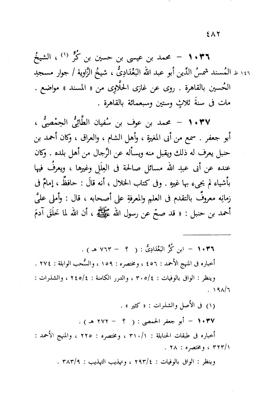 1037 - مُحَمَّد بن عَوْف بن سُفْيَان الطَّائِي الْحِمصِي أَبُو جَعْفَر سمع من أبي الْمُغيرَة وَأهل الشَّام وَالْعراق وَكَانَ أَحْمد بن حَنْبَل يعرف لَهُ ذَلِك وَيقبل مِنْهُ ويسأله عَن الرِّجَال من أهل بَلَده وَكَانَ عِنْده عَن أبي عبد الله مسَائِل صَالِحَة فِي الْعِلَل وَغَيرهَا وَيعرف فِيهَا بأَشْيَاء لم يَجِيء بهَا غَيره وَفِي كتاب الْخلال أَنه قَالَ حَافظ إِمَام فِي زَمَانه مَعْرُوف بالتقدم فِي الْعلم والمعرفة على أَصْحَابه قَالَ وأملى على أَحْمد بن حَنْبَل (قد صَحَّ عَن رَسُول الله أَن الله لما خلق آدم