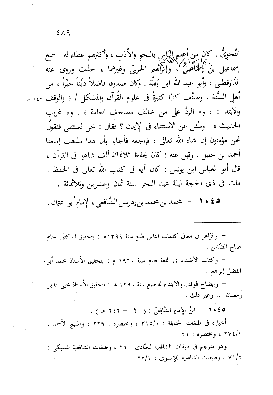 النَّحْوِيّ كَانَ من أعلم النَّاس بالنحو وَالْأَدب وَأَكْثَرهم عَطاء لَهُ سمع إِسْمَاعِيل بن إِسْمَاعِيل وَإِبْرَاهِيم الْحَرْبِيّ وَغَيرهمَا حدث وروى عَنهُ الدَّارَقُطْنِيّ وَأَبُو عبد الله ابْن بطة وَكَانَ صَدُوقًا فَاضلا دينا خيرا من أهل السّنة وصنف كتبا كَثِيرَة فِي عُلُوم الْقُرْآن والمشكل وَالْوَقْف والابتدا وَالرَّدّ على من خَالف مصحف الْعَامَّة وغريب الحَدِيث وَسُئِلَ عَن الِاسْتِثْنَاء فِي الْإِيمَان فَقَالَ نَحن نستثنى فَنَقُول نَحن مُؤمنُونَ إِن شَاءَ الله تَعَالَى فَرَاجعه فَأَجَابَهُ بِأَن هَذَا مَذْهَب إمامنا أَحْمد بن حَنْبَل وَقيل عَنهُ كَانَ يحفظ ثَلَاثمِائَة ألف شَاهد فِي الْقُرْآن قَالَ أَبُو الْعَبَّاس ابْن يُونُس كَانَ آيَة فِي كتاب الله تَعَالَى فِي الْحِفْظ مَاتَ فِي ذِي الْحجَّة لَيْلَة عيد النَّحْر سنة ثَمَان وَعشْرين وثلاثمائة