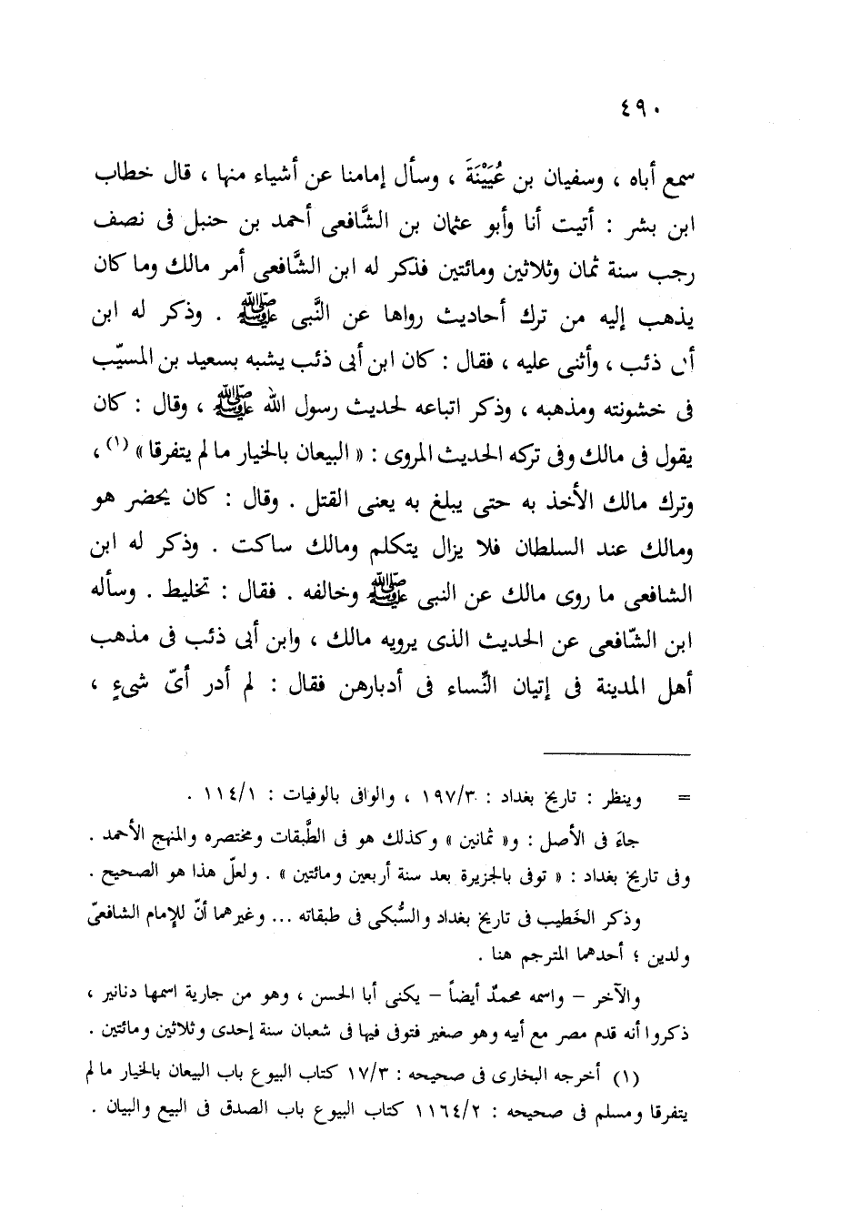 سمع أَبَاهُ وسُفْيَان بن عُيَيْنَة وَسَأَلَ إمامنا عَن أَشْيَاء مِنْهَا قَالَ خطاب ابْن بشر أتيت أَنا وَأَبُو عُثْمَان بن الشَّافِعِي أَحْمد بن حَنْبَل فِي نصف رَجَب سنة ثَمَان وَثَلَاثِينَ وَمِائَتَيْنِ فَذكر لَهُ ابْن الشَّافِعِي أَمر مَالك وَمَا كَانَ يذهب إِلَيْهِ من ترك أَحَادِيث رَوَاهَا عَن النَّبِي وَذكر لَهُ ابْن أبي ذِئْب وَأثْنى عَلَيْهِ فَقَالَ كَانَ ابْن أبي ذِئْب يشبه بِسَعِيد بن الْمسيب فِي خشونته ومذهبه وَذكر اتِّبَاعه لحَدِيث رَسُول الله وَقَالَ كَانَ يَقُول فِي مَالك وَفِي تَركه الحَدِيث المروى (البيعان بِالْخِيَارِ مَا لم يَتَفَرَّقَا) وَترك مَالك الْأَخْذ بِهِ حَتَّى يبلغ بِهِ يَعْنِي الْقَتْل وَقَالَ كَانَ يحضر هُوَ وَمَالك عِنْد السُّلْطَان فَلَا يزَال يتَكَلَّم وَمَالك سَاكِت وَذكر لَهُ ابْن الشَّافِعِي مَا روى مَالك عَن النَّبِي