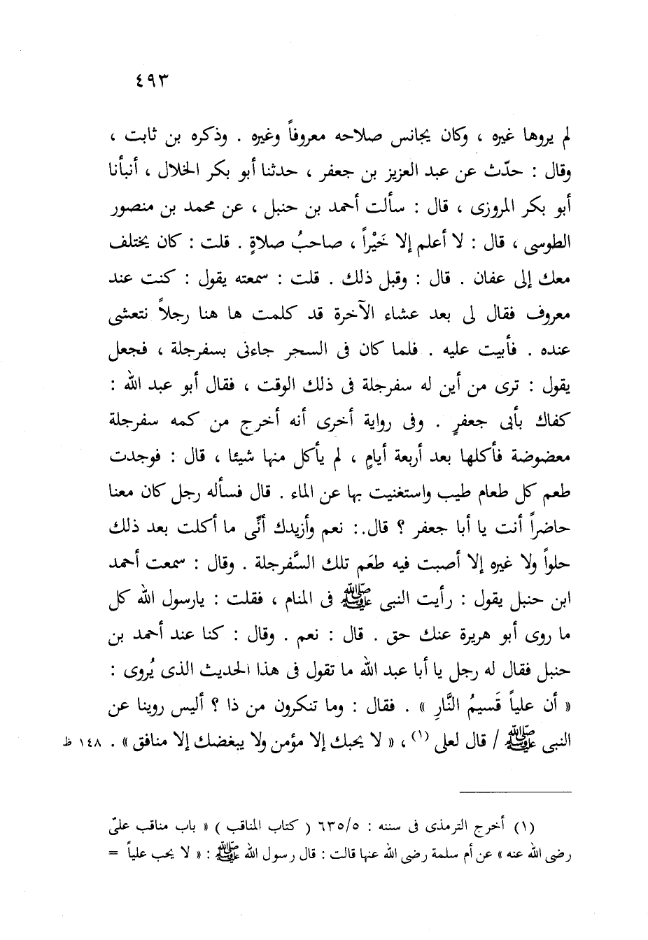 وَقَالَ سَمِعت أَحْمد ابْن حَنْبَل يَقُول رَأَيْت النَّبِي فِي الْمَنَام فَقلت يَا رَسُول الله كل مَا روى أَبُو هُرَيْرَة عَنْك حق قَالَ نعم وَقَالَ كُنَّا عِنْد أَحْمد بن حَنْبَل فَقَالَ لَهُ رجل يَا أَبَا عبد الله مَا تَقول فِي هَذَا الحَدِيث الَّذِي يرْوى (أَن عليا قسيم النَّار) فَقَالَ وَمَا تنكرون من ذَا أَلَيْسَ روينَا عَن النَّبِي قَالَ لعَلي (لَا يحبك إِلَّا مُؤمن وَلَا يبغضك إِلَّا مُنَافِق)