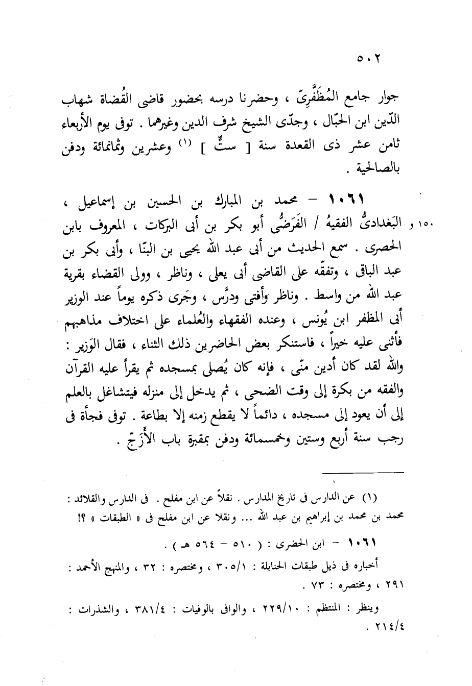 1061 - مُحَمَّد بن الْمُبَارك بن الْحُسَيْن بن إِسْمَاعِيل الْبَغْدَادِيّ الْفَقِيه الفرضي أَبُو بكر بن أبي البركات الْمَعْرُوف بِابْن الحصرى سمع الحَدِيث من أبي عبد الله يحيى بن الْبَنَّا وَأبي بكر بن عبد الْبَاقِي وتفقه على القَاضِي أبي يعلى وناظر وَولى الْقَضَاء بقرية عبد الله من وَاسِط
