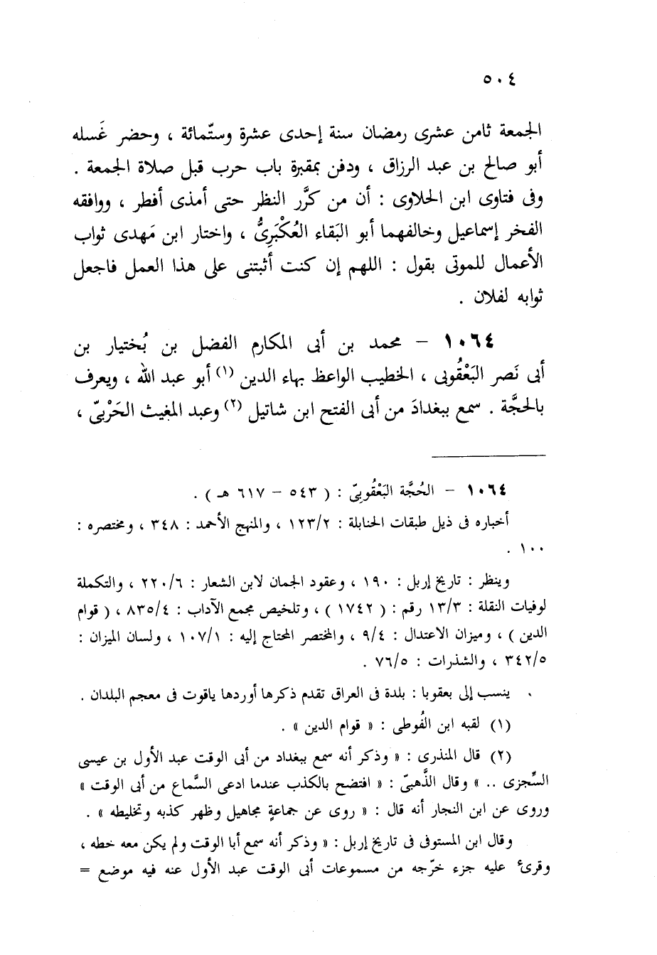 1064 - مُحَمَّد بن أبي المكارم الْفضل بن بختيار بن أبي نصر البعقوبي الْخَطِيب الْوَاعِظ بهاء الدّين أَبُو عبد الله وَيعرف بِالْحجَّةِ سمع بِبَغْدَاد من أبي الْفَتْح ابْن شاتيل وَعبد المغيث الْحَرْبِيّ