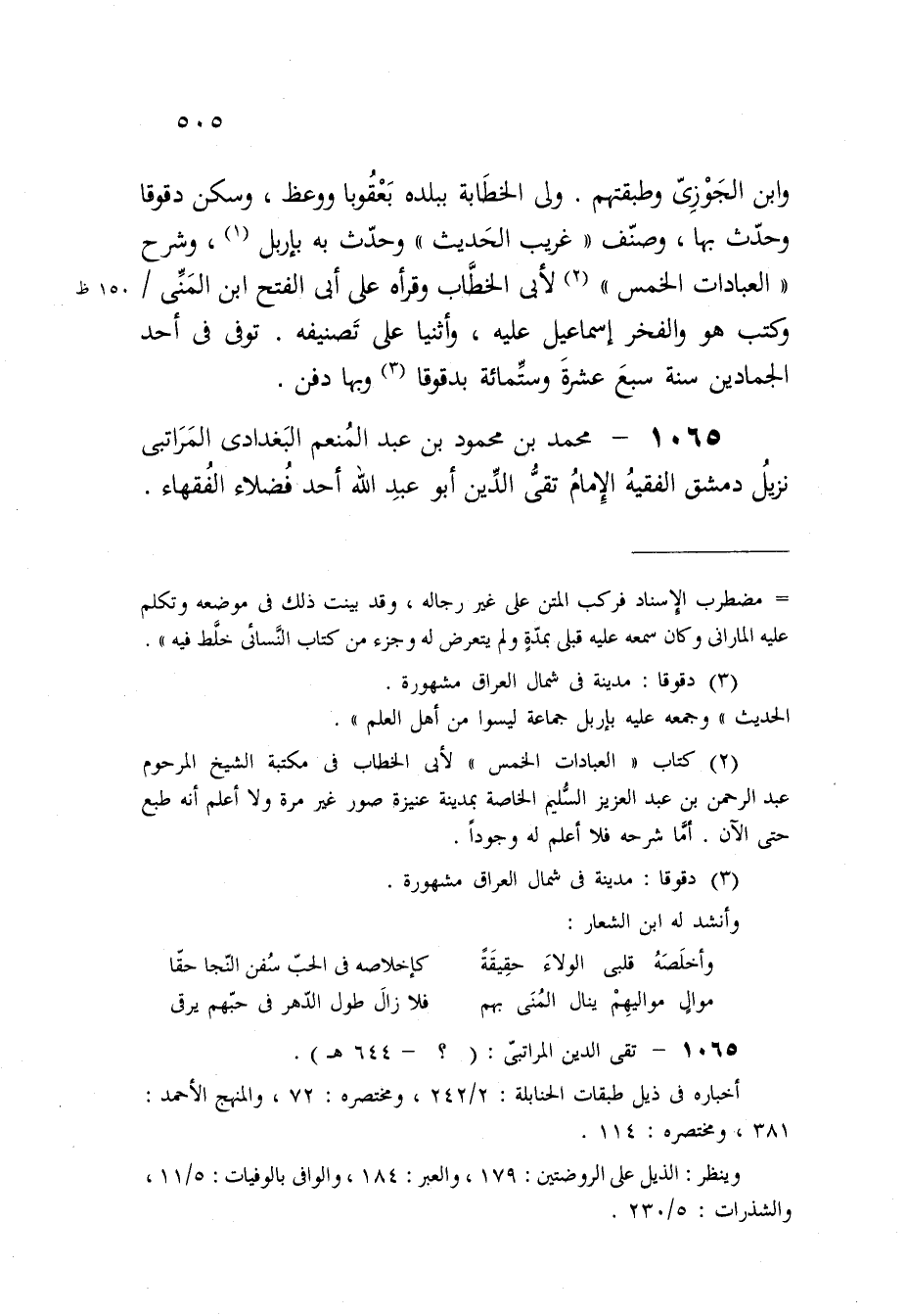 1065 - مُحَمَّد بن مَحْمُود بن عبد الْمُنعم الْبَغْدَادِيّ المراتبي نزيل دمشق الْفَقِيه الإِمَام تَقِيّ الدّين أَبُو عبد الله أحد فضلاء الْفُقَهَاء