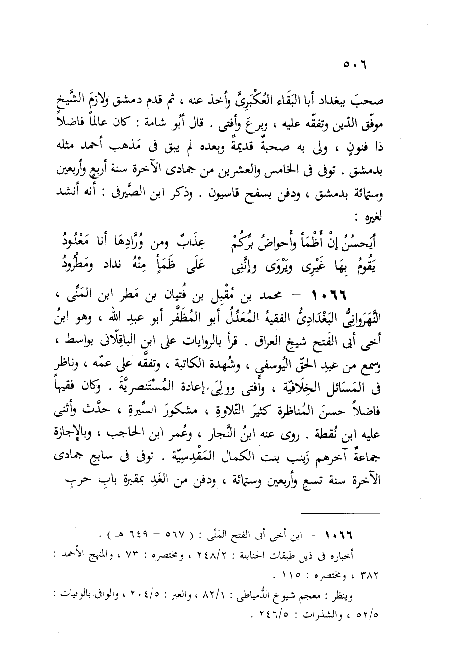 1066 - مُحَمَّد بن مقبل بن فتيَان بن مطر ابْن المنى النهرواني الْبَغْدَادِيّ الْفَقِيه الْمعدل أَبُو المظفر أَبُو عبد الله وَهُوَ ابْن أخي أبي الْفَتْح شيخ الْعرَاق