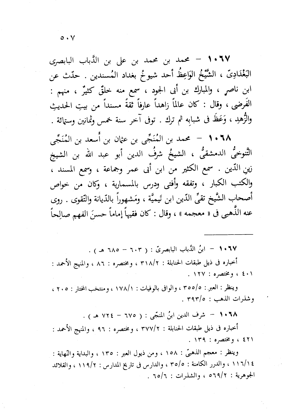 1068 - مُحَمَّد بن المنجي بن عُثْمَان بن أسعد بن المنجي التنوخي الدِّمَشْقِي الشَّيْخ شرف الدّين أَبُو عبد الله بن الشَّيْخ زين الدّين سمع الْكثير من ابْن أبي عمر وَجَمَاعَة وَسمع الْمسند والكتب الْكِبَار وتفقه وَأفْتى ودرس بالمسمارية وَكَانَ من خَواص أَصْحَاب الشَّيْخ تَقِيّ الدّين ابْن تَيْمِية ومشهورا بالديانة وَالتَّقوى روى عَنهُ الذَّهَبِيّ فِي مُعْجَمه وَقَالَ كَانَ فَقِيها إِمَامًا حسن الْفَهم صَالحا