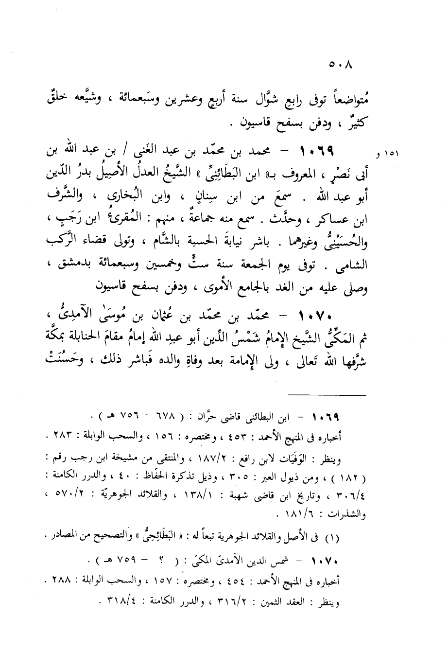 1070 - مُحَمَّد بن مُحَمَّد بن عُثْمَان بن مُوسَى الْآمِدِيّ ثمَّ الْمَكِّيّ الشَّيْخ الإِمَام شمس الدّين أَبُو عبد الله إِمَام مقَام الْحَنَابِلَة بِمَكَّة شرفها الله تَعَالَى ولى الْإِمَامَة بعد وَفَاة وَالِده فباشر ذَلِك وَحسنت