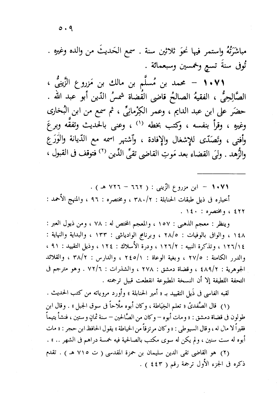 1071 - مُحَمَّد بن مُسلم بن مَالك بن مزروع الزيني الصَّالِحِي الْفَقِيه الصَّالح قَاضِي الْقُضَاة شمس الدّين أَبُو عبد الله حضر عَليّ ابْن عبد الدايم وَعمر الْكرْمَانِي ثمَّ سمع من ابْن البُخَارِيّ وَغَيره وَقَرَأَ بِنَفسِهِ وَكتب بِخَطِّهِ وعنى بِالْحَدِيثِ وتفقه وبرع وَأفْتى وتصدى للإشغال والإفادة واشتهر اسْمه مَعَ الدّيانَة والورع والزهد ولى الْقَضَاء بعد موت القَاضِي تَقِيّ الدّين فتوقف فِي الْقبُول