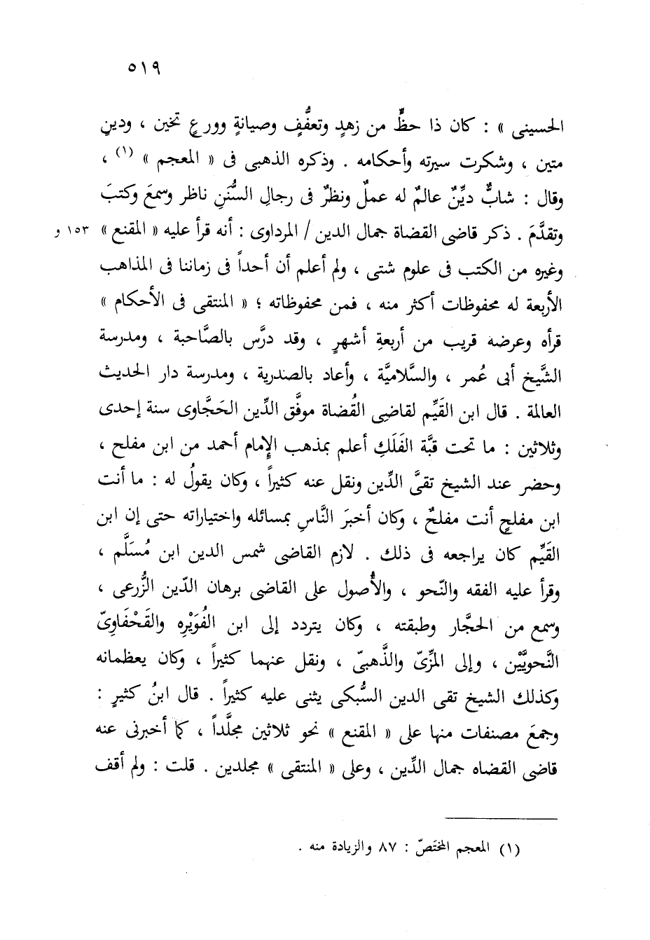 الْحُسَيْنِي كَانَ ذَا حَظّ من زهد وتعفف وصيانة وورع تخين وَدين متين وشكرت سيرته وَأَحْكَامه وَذكره الذَّهَبِيّ فِي المعجم وَقَالَ شَاب دين عَالم لَهُ عمل وَنظر فِي رجال السّنَن نَاظر وَسمع وَكتب وَتقدم ذكر قَاضِي الْقُضَاة جمال الدّين المرداوي أَنه قَرَأَ عَلَيْهِ الْمقنع وَغَيره من الْكتب فِي عُلُوم شَتَّى وَلم أعلم أَن أحدا فِي زَمَاننَا فِي الْمذَاهب الْأَرْبَعَة لَهُ محفوظات أَكثر مِنْهُ فَمن محفوظاته الْمُنْتَقى فِي الْأَحْكَام قَرَأَهُ وَعرضه قريب من أَرْبَعَة أشهر وَقد درس بالصاحبة ومدرسة الشَّيْخ أبي عمر والسلامية وَأعَاد بالصدرية ومدرسة دَار الحَدِيث العالمة