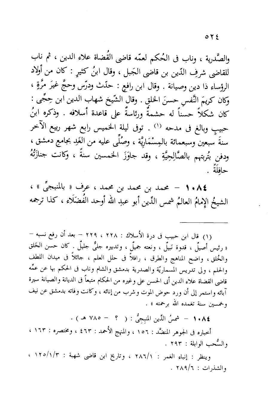 1084 - مُحَمَّد بن مُحَمَّد بن مُحَمَّد عرف بالمنبجي الشَّيْخ الإِمَام الْعَالم شمس الدّين أَبُو عبد الله أوحد الْفُضَلَاء كَذَا تَرْجمهُ