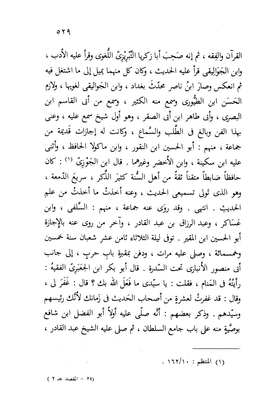 انْتهى وَقد روى عَنهُ جمَاعَة مِنْهُم السلفى وَابْن عَسَاكِر وَعبد الرَّزَّاق بن عبد الْقَادِر وَآخر من روى عَنهُ بِالْإِجَازَةِ أَبُو الْحُسَيْن ابْن المقير توفّي لَيْلَة الثُّلَاثَاء ثامن عشر شعْبَان سنة خمسين وَخَمْسمِائة وَصلى عَلَيْهِ مَرَّات وَدفن بمقبرة بَاب حَرْب إِلَى جَانب أبي مَنْصُور الْأَنْبَارِي تَحت السِّدْرَة قَالَ أَبُو بكر ابْن الجعبري الْفَقِيه رَأَيْته فِي الْمَنَام فَقلت يَا سَيِّدي مَا فعل الله بك قَالَ غفر لي وَقَالَ قد غفرت لعشرة من أَصْحَاب الحَدِيث فِي زَمَانك لِأَنَّك رئيسهم وسيدهم