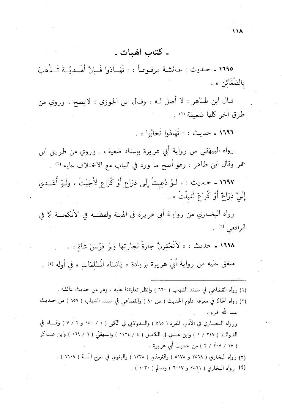 1695- حديث: عائشة مرفوعًا: "تهادوا فإن الهدية تذهب بالضغائن".