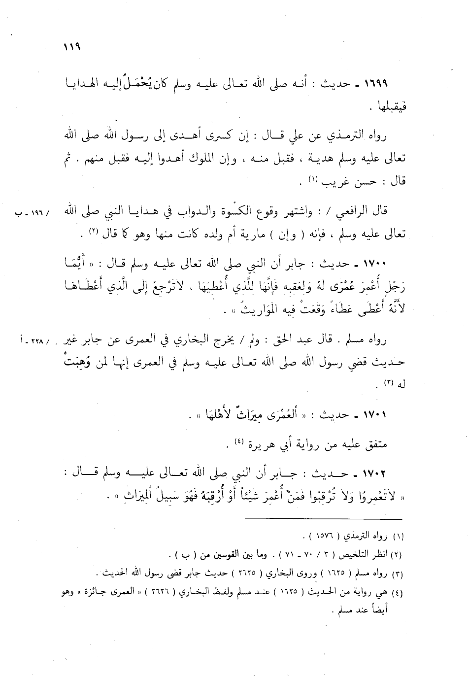 4 هي رواية من الحديث 1625 عند مسلم ولفظ البخاري 2626 العمري جائزة وهو أيضًا عند مسلم.