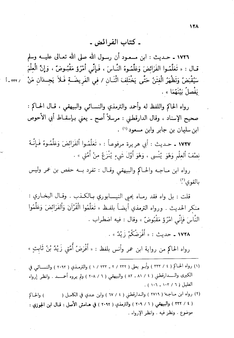 1726- حديث: ابن مسعود أن رسول الله صلى الله تعالى عليه وسلم، قال: "تعلموا الفرائض وعلموه الناس، فإني امرؤ مقبوض، وإن العلم سيقبض وتظهر الفتن حتى يختلف اثنان في الفريضة فلا يجدان من يفصل بينهما".