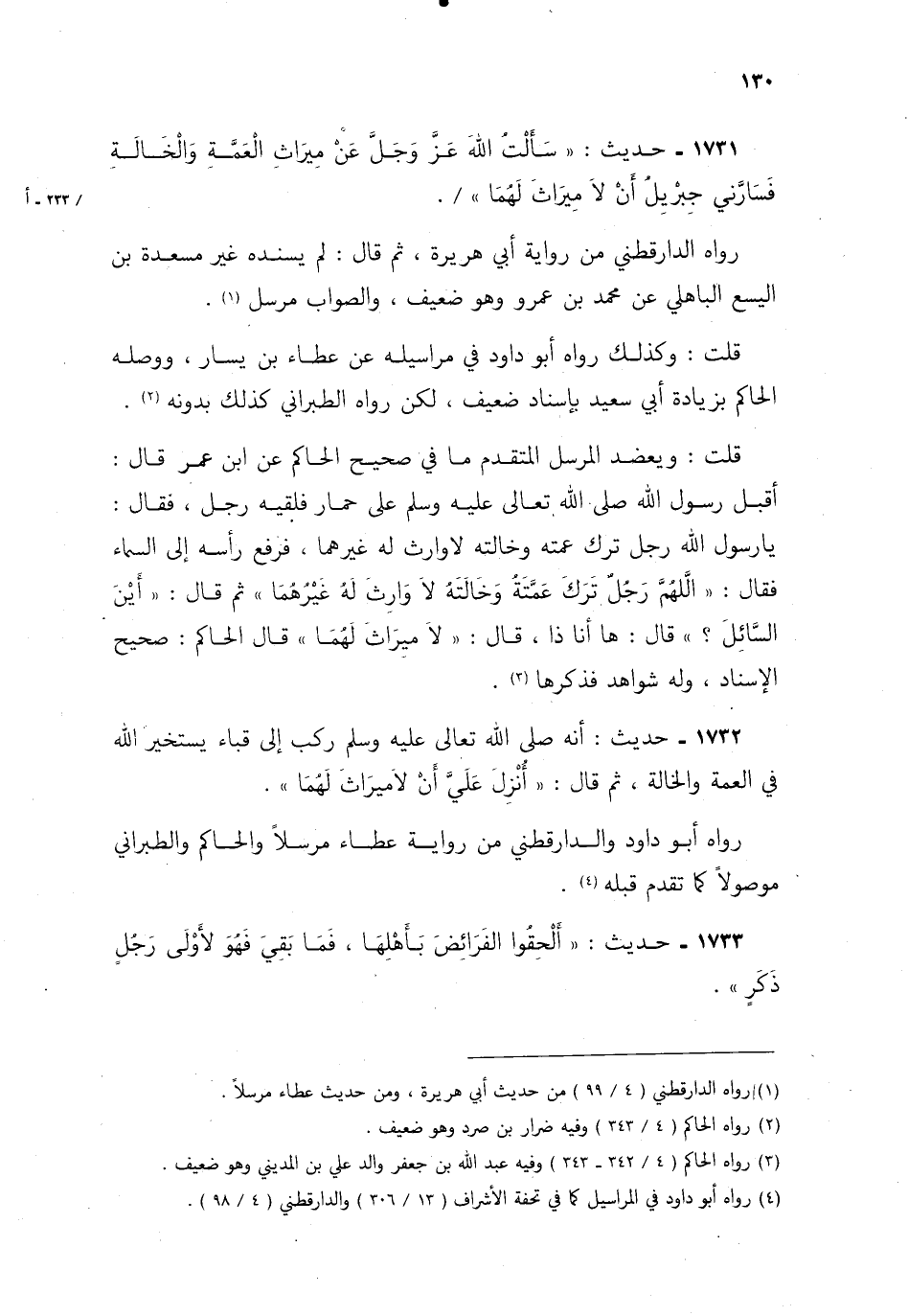 1731- حديث: "سألت الله -عز وجل- عن ميراث العمة والخالة فسارني جبريل أن لا ميراث لهما".