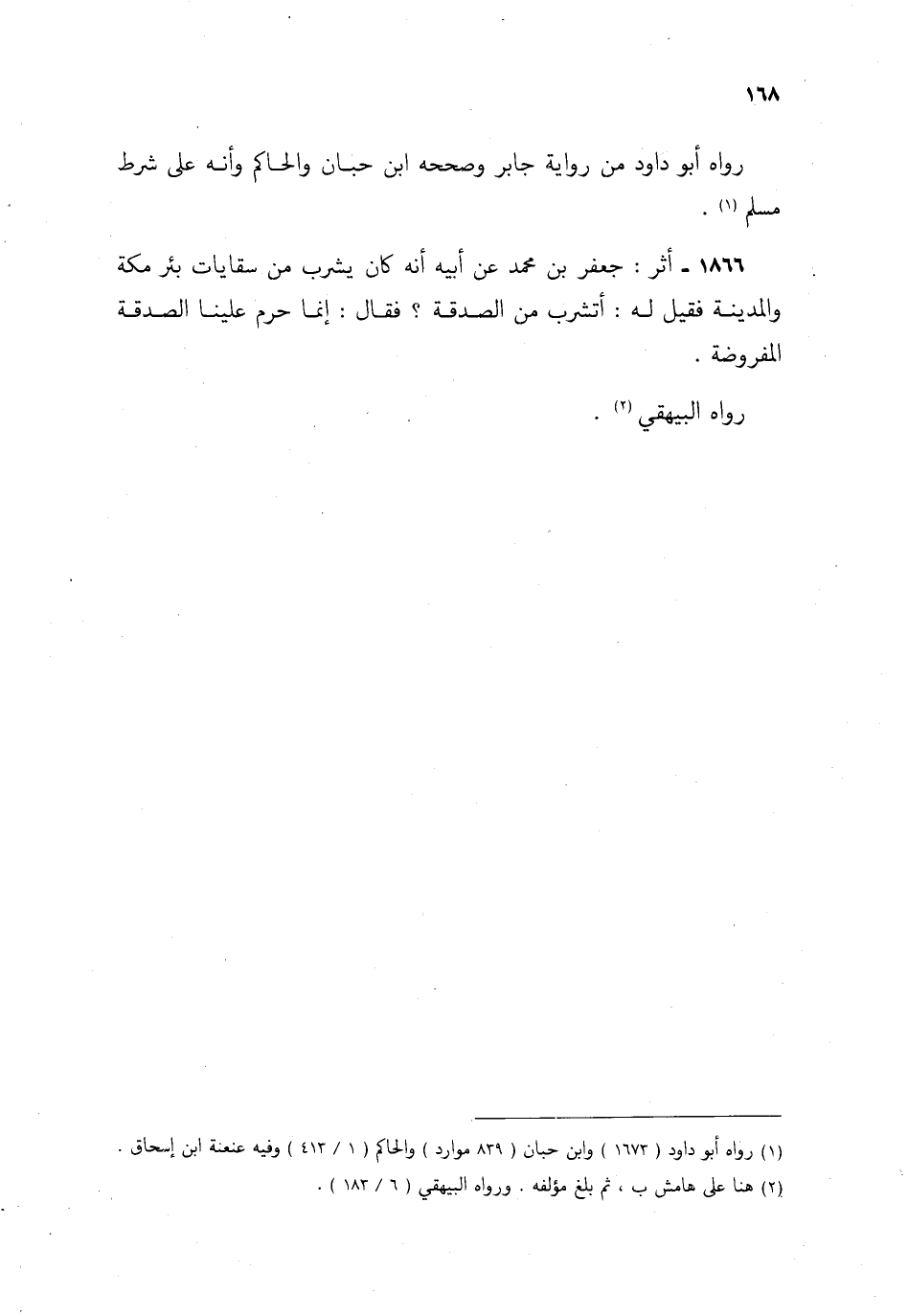 1866- أثر: جعفر بن محمد، عن أبيه أنه كان يشرب من سقايات بئر مكة والمدينة، فقيل له: أتشرب من الصدقة؟ فقال: إنما حرم علينا الصدقة المفروضة.