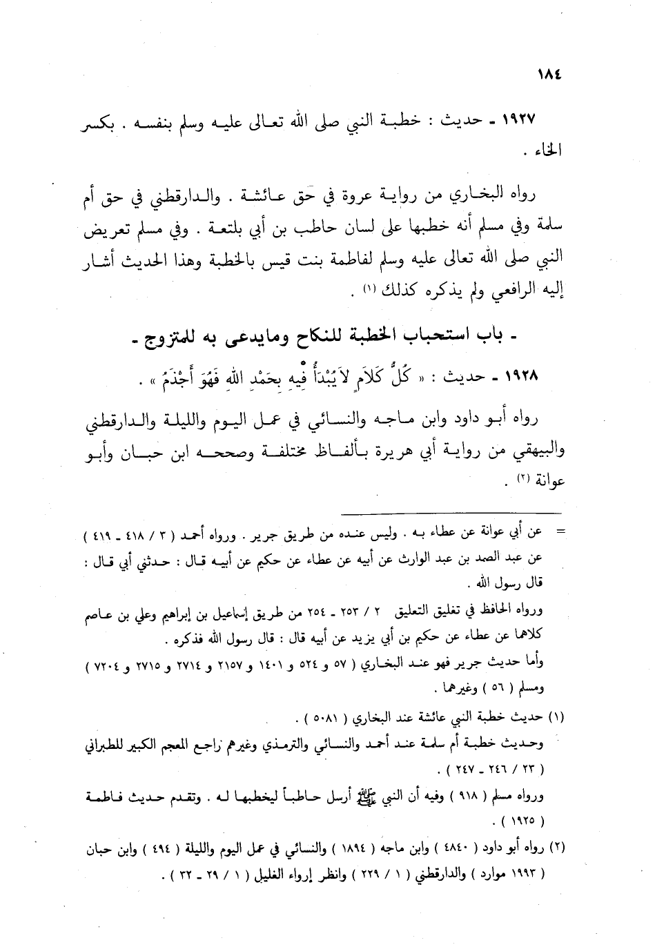 1 حديث خطبة النبي عائشة عند البخاري 5081، وحديث خطبة أم سلمة عند أحمد، والنسائي والترمذي وغيرهم راجع المعجم الكبير للطبراني 23/ 246-247، ورواه مسلم 918 وفيه أن النبي صلى الله تعالى عليه وسلم أرسل حاطبًا ليخطبها له. وتقدم حديث فاطمة 1925.