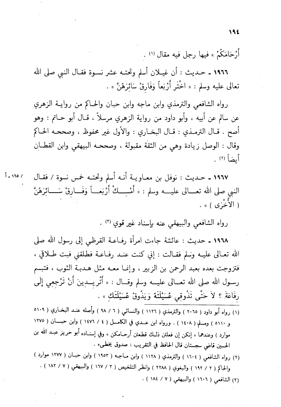 1967- حديث: نوفل بن معاوية أنه أسلم وتحته خمس نسوة، فقال النبي صلى الله تعالى عليه وسلم: "أمسك أربعًا وفارق سائرهن الأخرى".