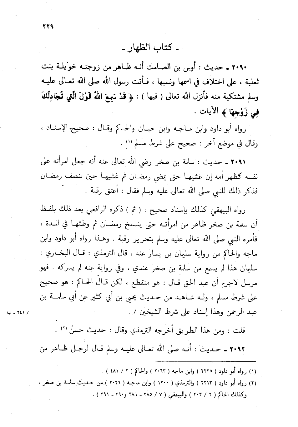 2091- حديث: سلمة بن صخر رضي الله تعالى عنه أنه جعل امرأته على نفسه كظهر أمه إن غشيها حتى يمضي رمضان ثم غشيها حين تنصف رمضان فذكر ذلك للنبي صلى الله تعالى عليه وسلم، فقال: أعتق رقبة.