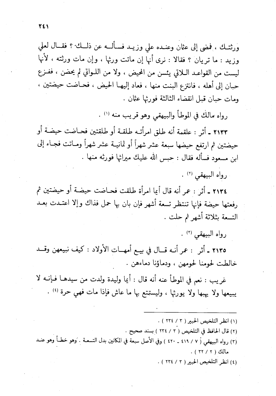 2134- أثر: عمر أنه قال: أيما امرأة طلقت فحاضت حيضة أو حيضتين، ثم رفعها حيضة فإنها تنتظر تسعة أشهر فإن بان بها حمل فذاك وإلا اعتدت بعد التسعة بثلاثة أشهر ثم حلت.