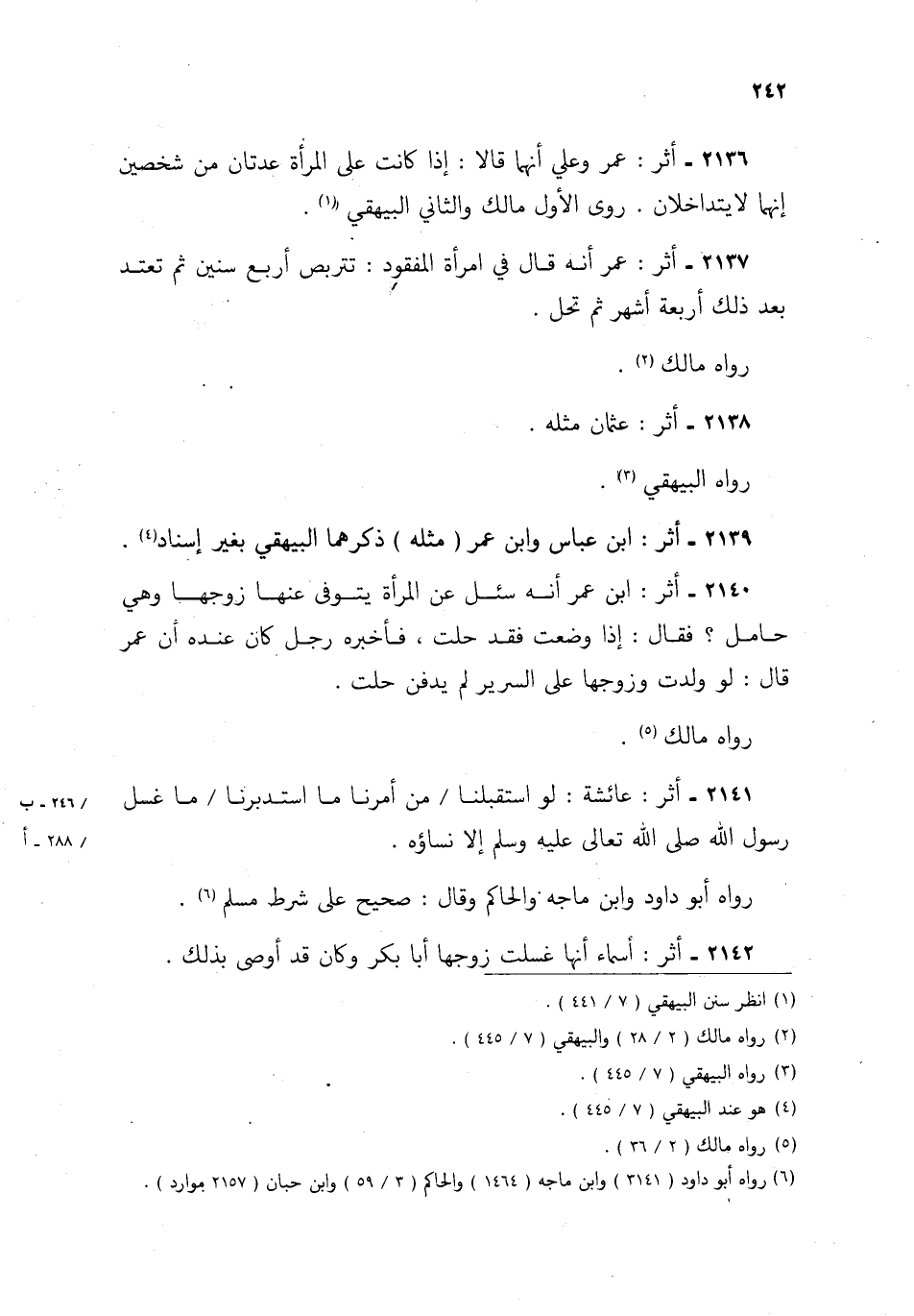 2136- أثر: عمر وعلي أنهما قالا: إذا كانت على المرأة عدتان من شخصين إنما لا يتداخلان. روى الأول مالك والثاني البيهقي1.