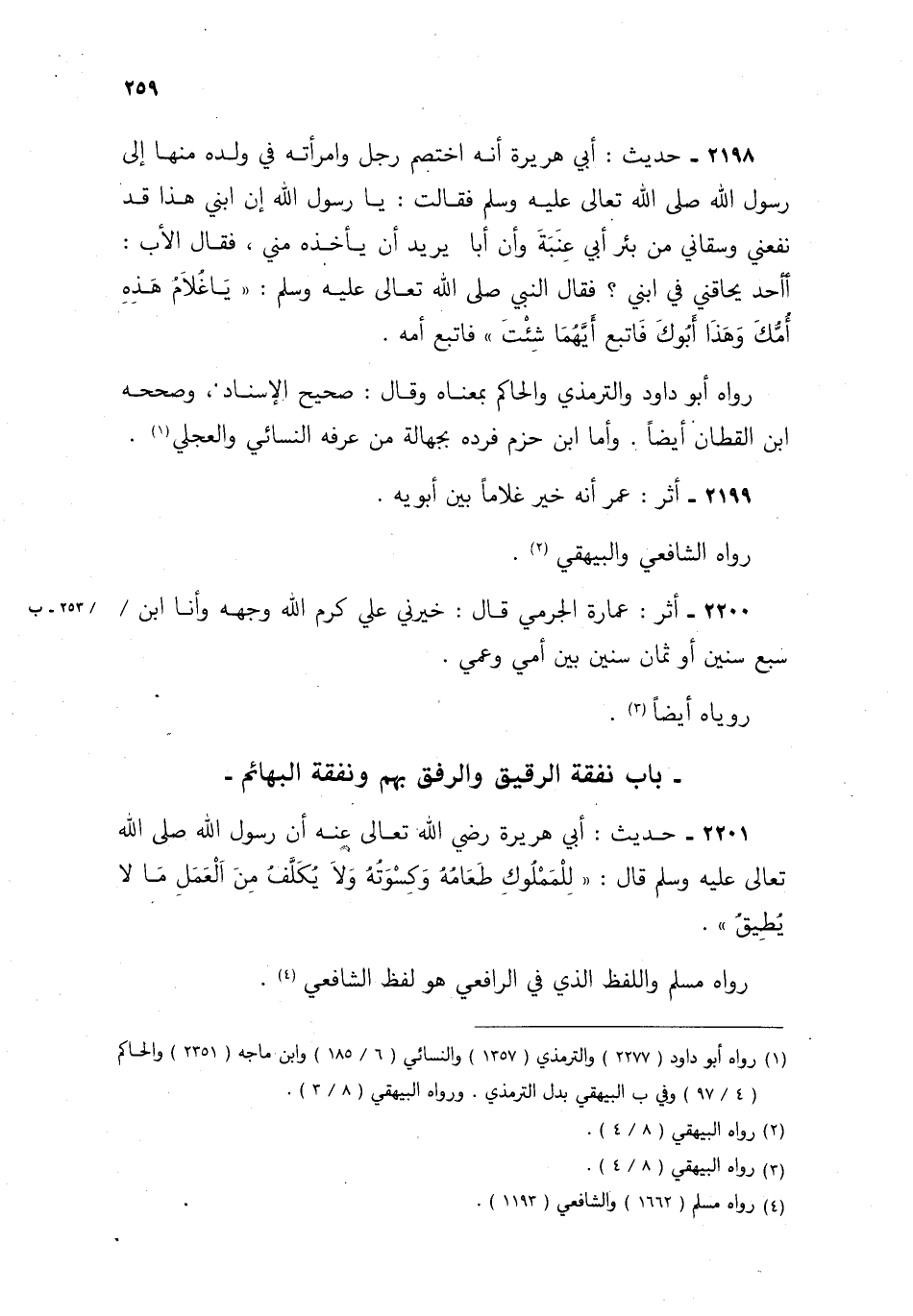 2198- حديث: أبي هريرة أنه اختصم رجل وامرأته في ولده منها إلى رسول الله صلى الله تعالى عليه وسلم، فقالت: يا رسول الله إن ابني هذا قد نفعني وسقاني من بئر أبي عنبة وأن أبا ريد أن يأخذه مني، فقال الأب: أأحد يحاقني في ابني؟ فقال النبي صلى الله تعالى عليه وسلم: "يا غلام هذه أمك وهذا أبوك فاتبع أيهما شئت"، فاتبع أمه.