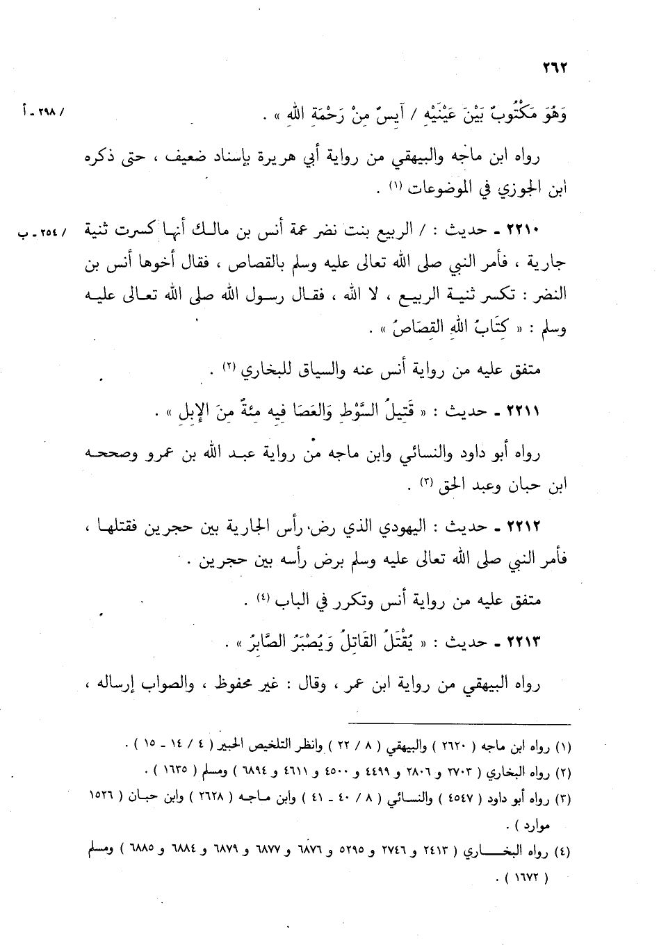 2210- حديث: الربيع بنت نضر عمة أنس بن مالك أنها كسرت ثنية جارية، فأمر النبي صلى الله تعالى عليه وسلم بالقصاص، فقال أخوها أنس بن النضر: تكسر ثنية الربيع، لا والله، فقال رسول الله صلى الله تعالى عليه وسلم: "كتاب الله القصاص".