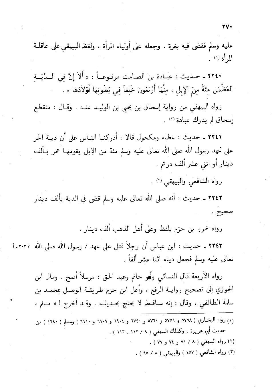 2241- حديث: عطاء ومكحول، قالا: أدركنا الناس على أن دية الحر على عهد رسول الله صلى الله تعالى عليه وسلم مئة من الإبل يقومها عمر بألف دينار أو اثني عشر ألف درهم.