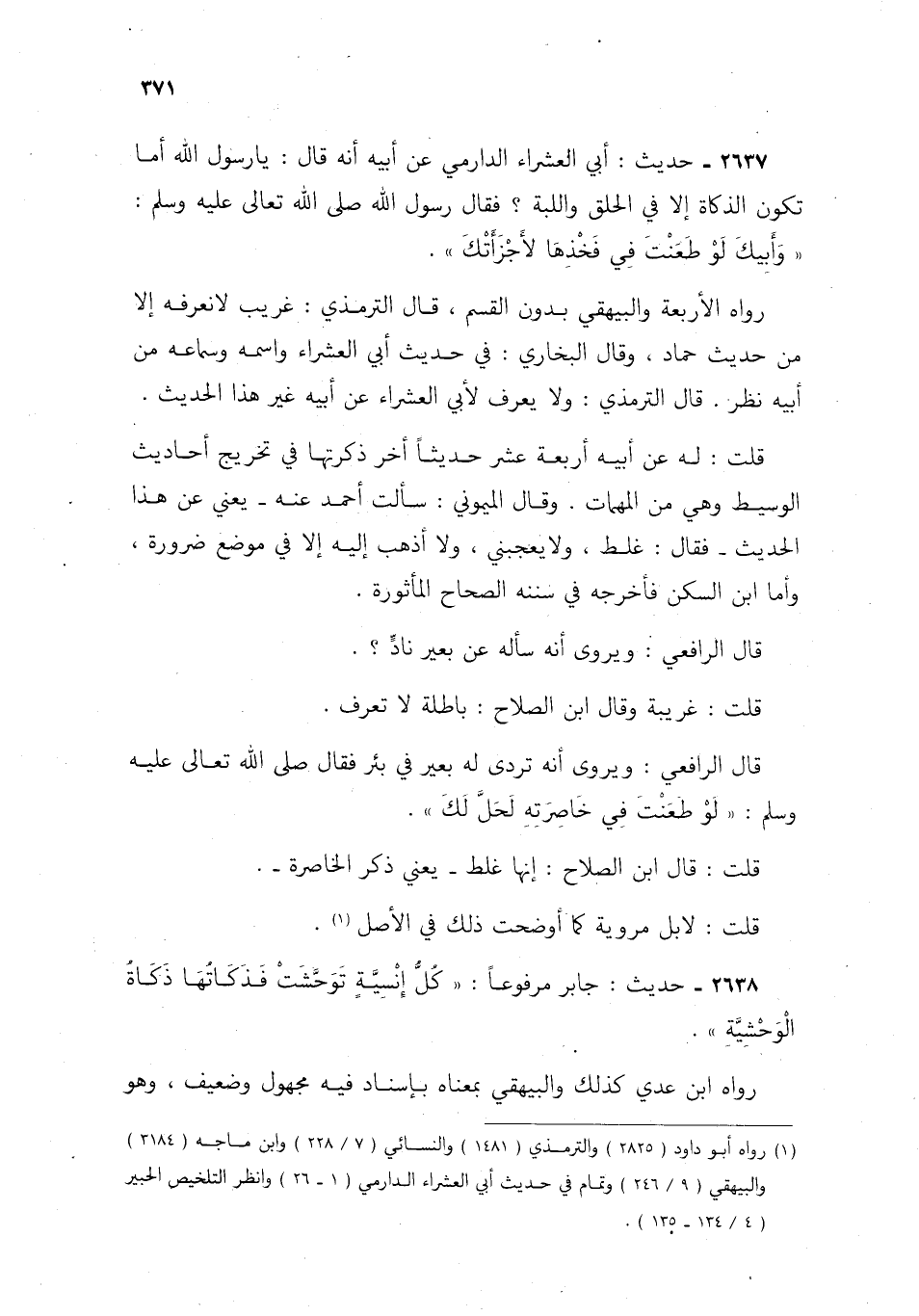 1 رواه أبو داود 2825 والترمذي 1481 والنسائي 228/ 7 وابن ماجه 3184 والبيهقي 246/ 9 وتمام في حديث أبي العشراء الدارمي 26/ 1 وانظر التلخيص الحبير 134/ 4-135.