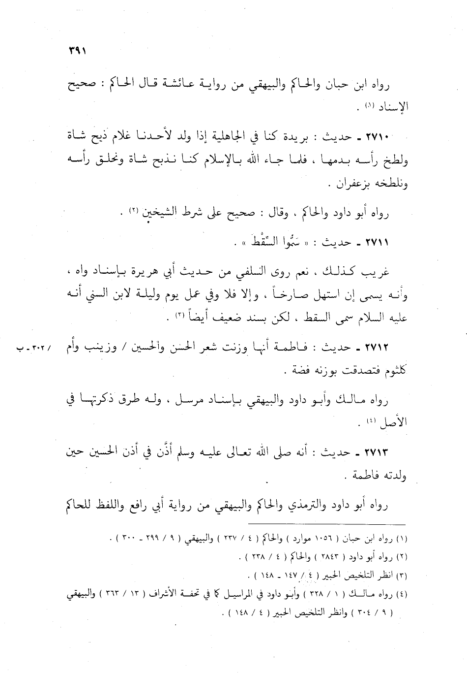 2712- حديث: فاطمة أنها وزنت شعر الحسن والحسين وزينب، وأم كلثوم فتصدقت بوزنه فضة.