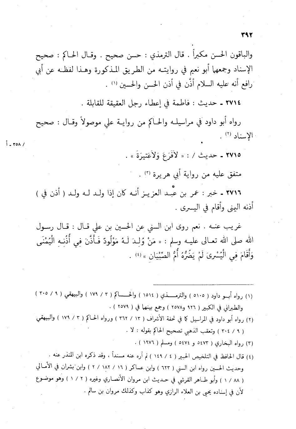 والباقون الحسن مكبرًا. قال الترمذي: حسن صحيح. وقال الحاكم: صحيح الإسناد وجمعهما أبو نعيم في روايته من الطريق المذكورة وهذا لفظه، عن أبي رافع أنه عليه الصلاة السلام أذن في أذن الحسن والحسين1.