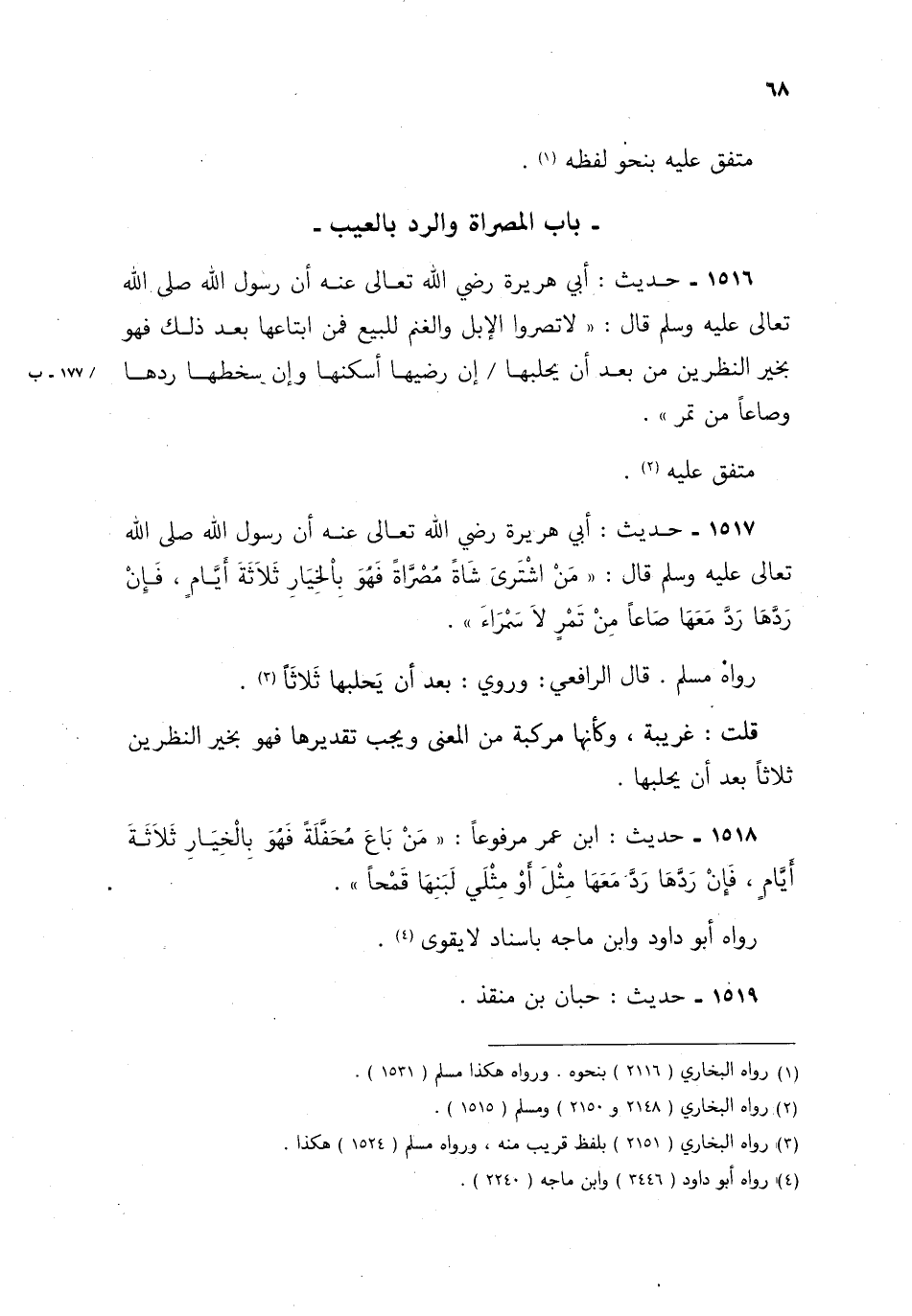 1516- حديث: أبي هريرة رضي الله تعالى عنه أن رسول الله صلى الله تعالى عليه وسلم، قال: "لا تصروا الإبل والغنم للبيع فمن ابتاعها بعد ذلك فهو بخير النظرين من بعد أن يحلبها إن رضيها أسكنها وإن سخطها ردها وصاعًا من تمر".