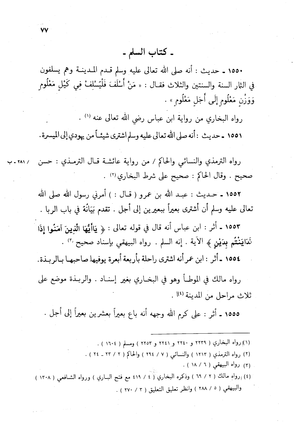 1554- أثر: ابن عمر أنه اشترى راحلة بأربعة أبعرة يوفيها صاحبها بالربذة.