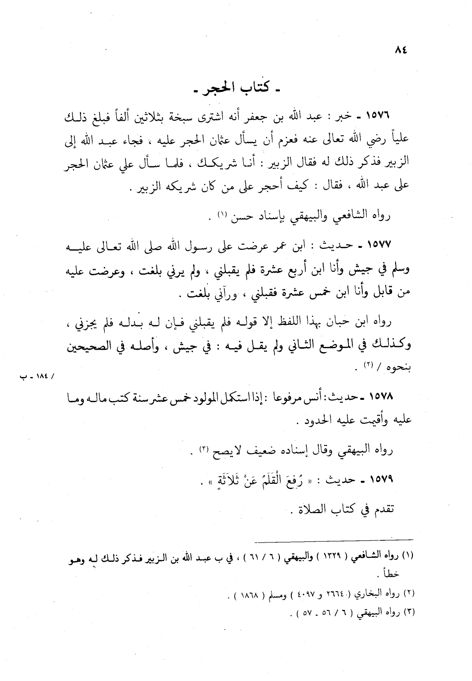 1576- خبر: عبد الله بن جعفر أنه اشترى سبخة بثلاثين ألفًا فبلغ ذلك عليًّا رضي الله تعلى عنه فعزم أن يسأل عثمان الحجر عليه، فجاء عبد الله إلى الزبير فذكر ذلك له، فقال الزبير: إنا شريكك، فلما سأل علي عثمان الحجر على عبد الله، فقال: كيف أحجر على من كان شريكه الزبير.
