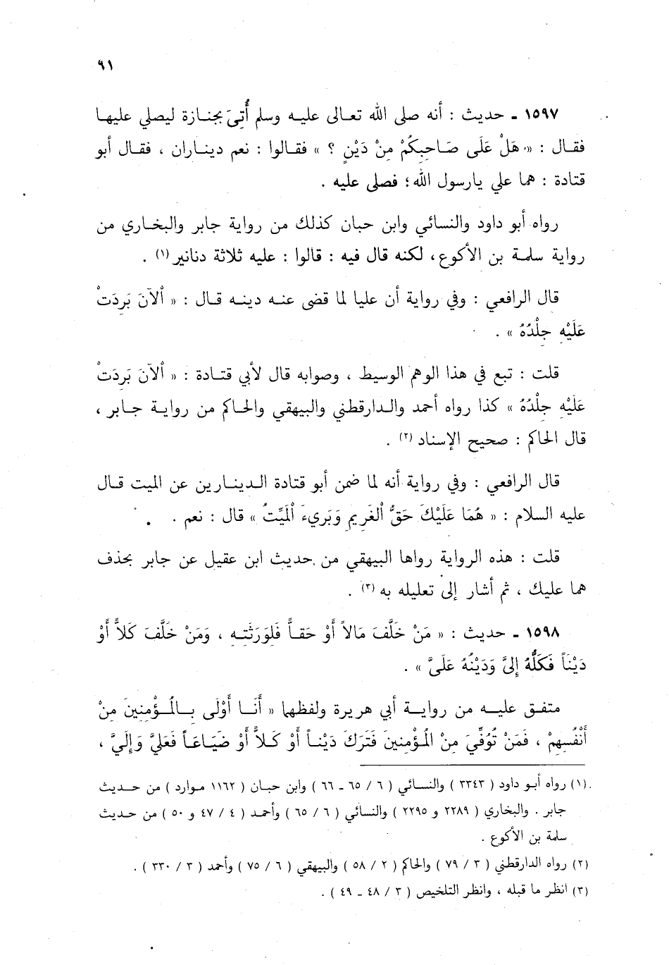 1597- حديث: أنه صلى الله تعالى عليه وسلم أتى بجنازة ليصلى عليها، فقال: "هل على صاحبكم من دين؟ " فقالوا: نعم ديناران، فقال أبو قتادة: هما علي يا رسول الله، فصلى عليه.
