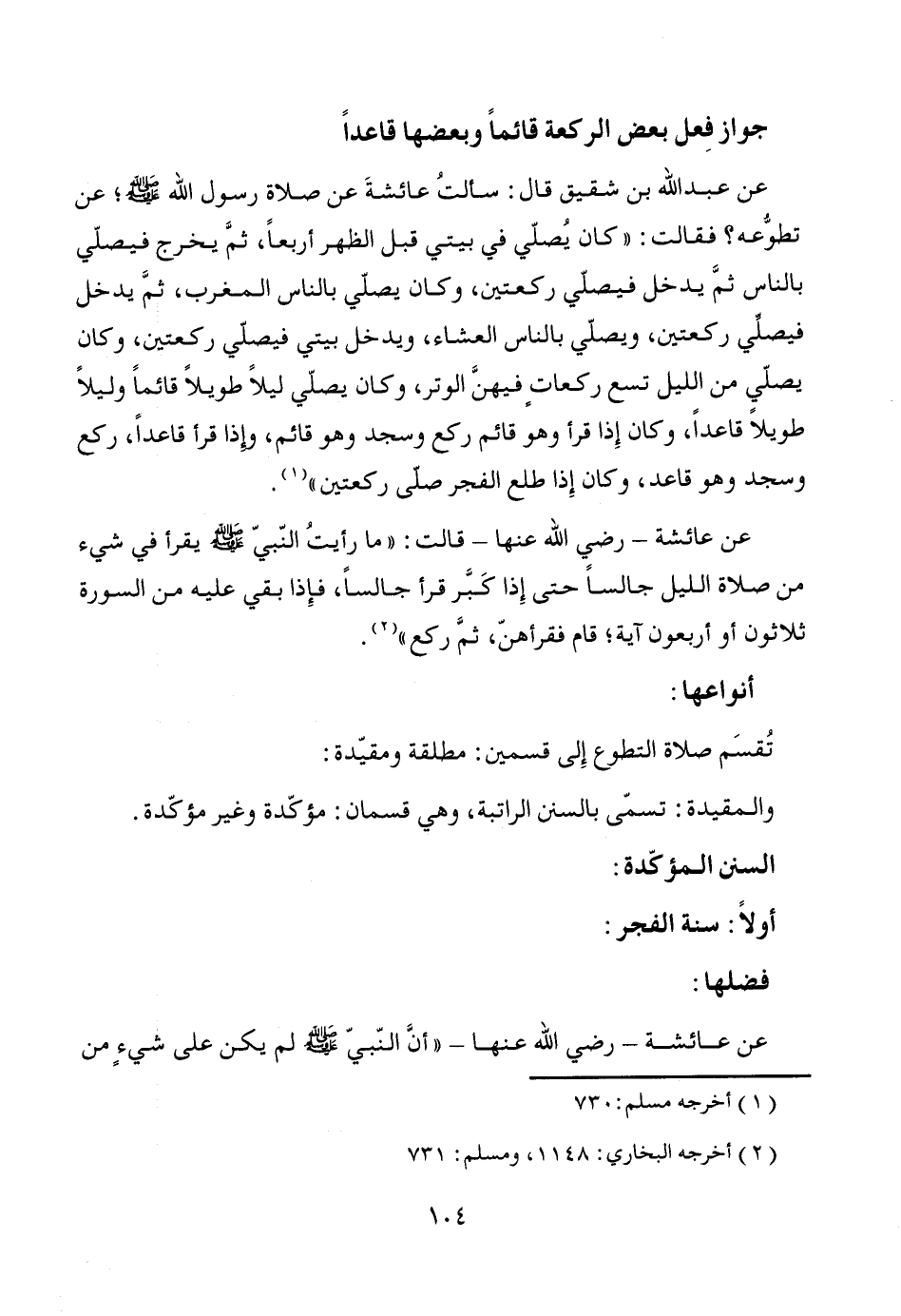 عن عبد الله بن شقيق قال: سألتُ عائشةَ عن صلاة رسول الله - صَلَّى اللَّهُ عَلَيْهِ وَسَلَّمَ -؛ عن تطوُّعه؟ فقالت: "كان يُصلّي في بيتي قبل الظهر أربعاً، ثمَّ يخرج فيصلّي بالناس ثمَّ يدخل فيصلّي ركعتين، وكان يصلّي بالناس المغرب، ثمَّ يدخل فيصلِّي ركعتين، ويصلّي بالناس العشاء، ويدخل بيتي فيصلّي ركعتين، وكان يصلّي من الليل تسع ركعاتٍ فيهنَّ الوتر، وكان يصلّي ليلاً طويلاً قائماً وليلاً طويلاً قاعداً، وكان إِذا قرأ وهو قائم ركع وسجد وهو قائم، وإذا قرأ قاعداً، ركع وسجد وهو قاعد، وكان إِذا طلع الفجر صلّى ركعتين" (¬1).