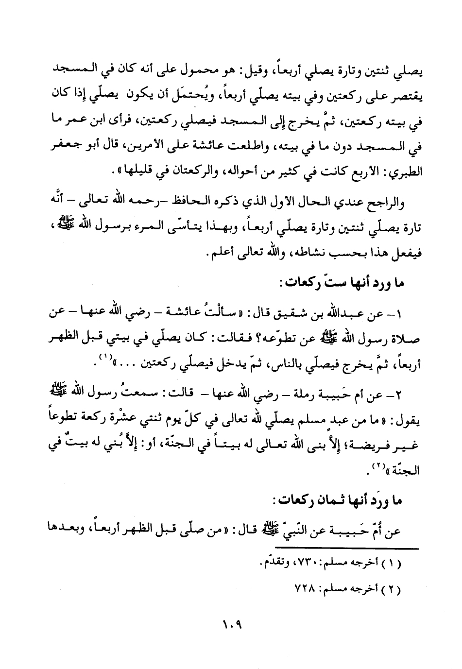 1 - عن عبد الله بن شقيق قال: "سألْتُ عائشة -رضي الله عنها- عن صلاة رسول الله - صَلَّى اللَّهُ عَلَيْهِ وَسَلَّمَ - عن تطوّعه؟ فقالت: كان يصلّي في بيتي قبل الظهر أربعاً، ثمَّ يخرج فيصلّي بالناس، ثمّ يدخل فيصلي ركعتين ... " (¬1).