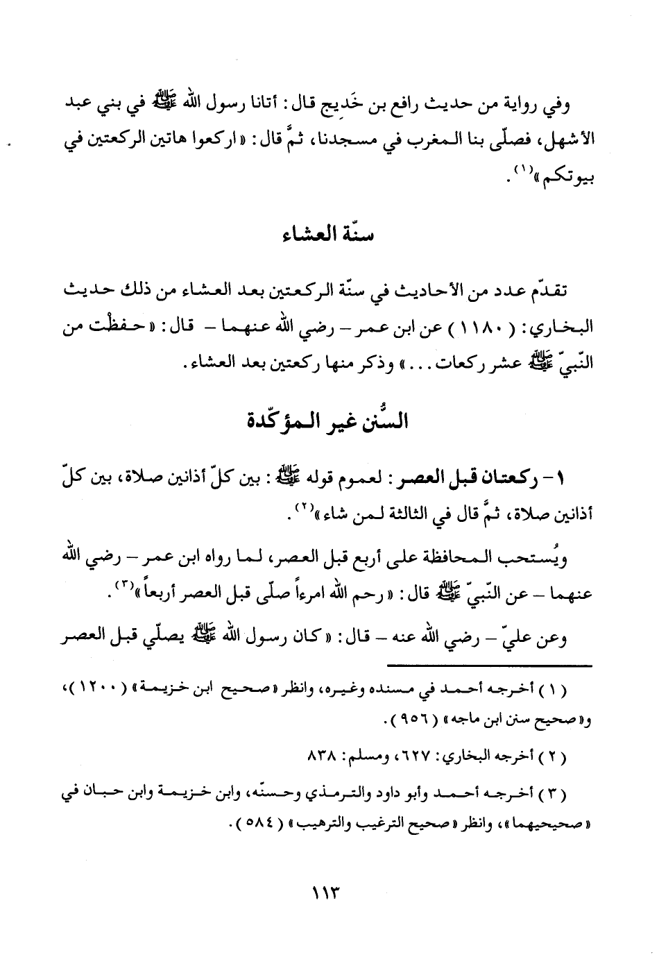 1 - ركعتان قبل العصر: لعموم قوله - صَلَّى اللَّهُ عَلَيْهِ وَسَلَّمَ -: بين كلّ أذانين صلاة، بين كلّ أذانين صلاة، ثمَّ قال في الثالثة لمن شاء" (¬2).