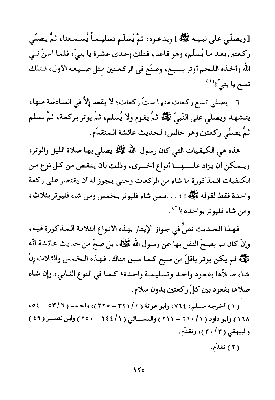 هذه هي الكيفيات التي كان رسول الله - صَلَّى اللَّهُ عَلَيْهِ وَسَلَّمَ - يصلي بها صلاة الليل والوتر، ويمكن أن يزاد عليها أنواع أخرى، وذلك بأن ينقص من كل نوع من الكيفيات المذكورة ما شاء من الركعات وحتى يجوز له أن يقتصر على ركعة واحدة فقط لقوله - صَلَّى اللَّهُ عَلَيْهِ وَسَلَّمَ -: " ... فمن شاء فليوتر بخمس ومن شاء فليوتر بثلاث، ومن شاء فليوتر بواحدة" (¬2).