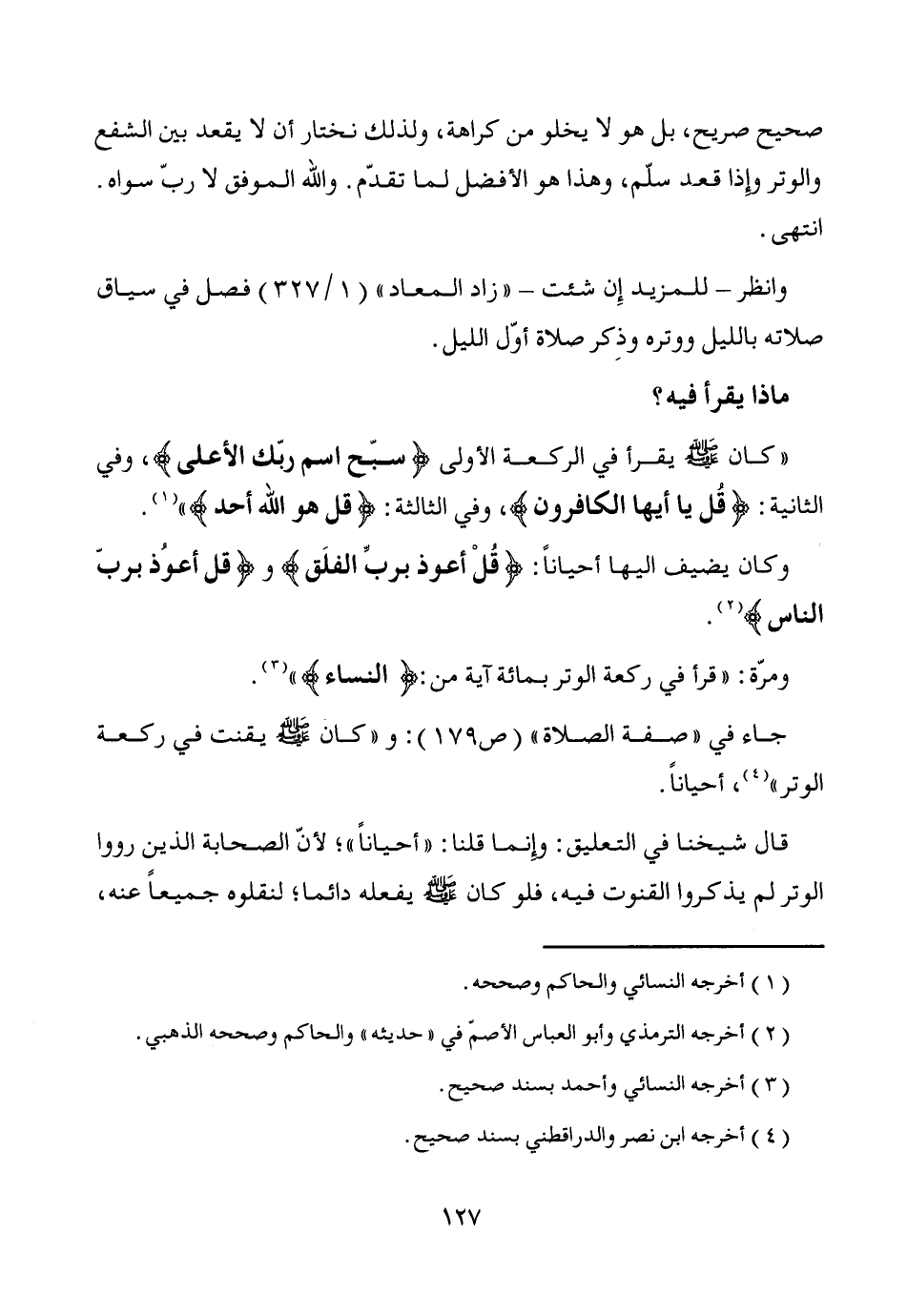 جاء في "صفة الصلاة" (ص 179): و"كان - صَلَّى اللَّهُ عَلَيْهِ وَسَلَّمَ - يقنت في ركعة الوتر" (¬4)، أحياناً.
