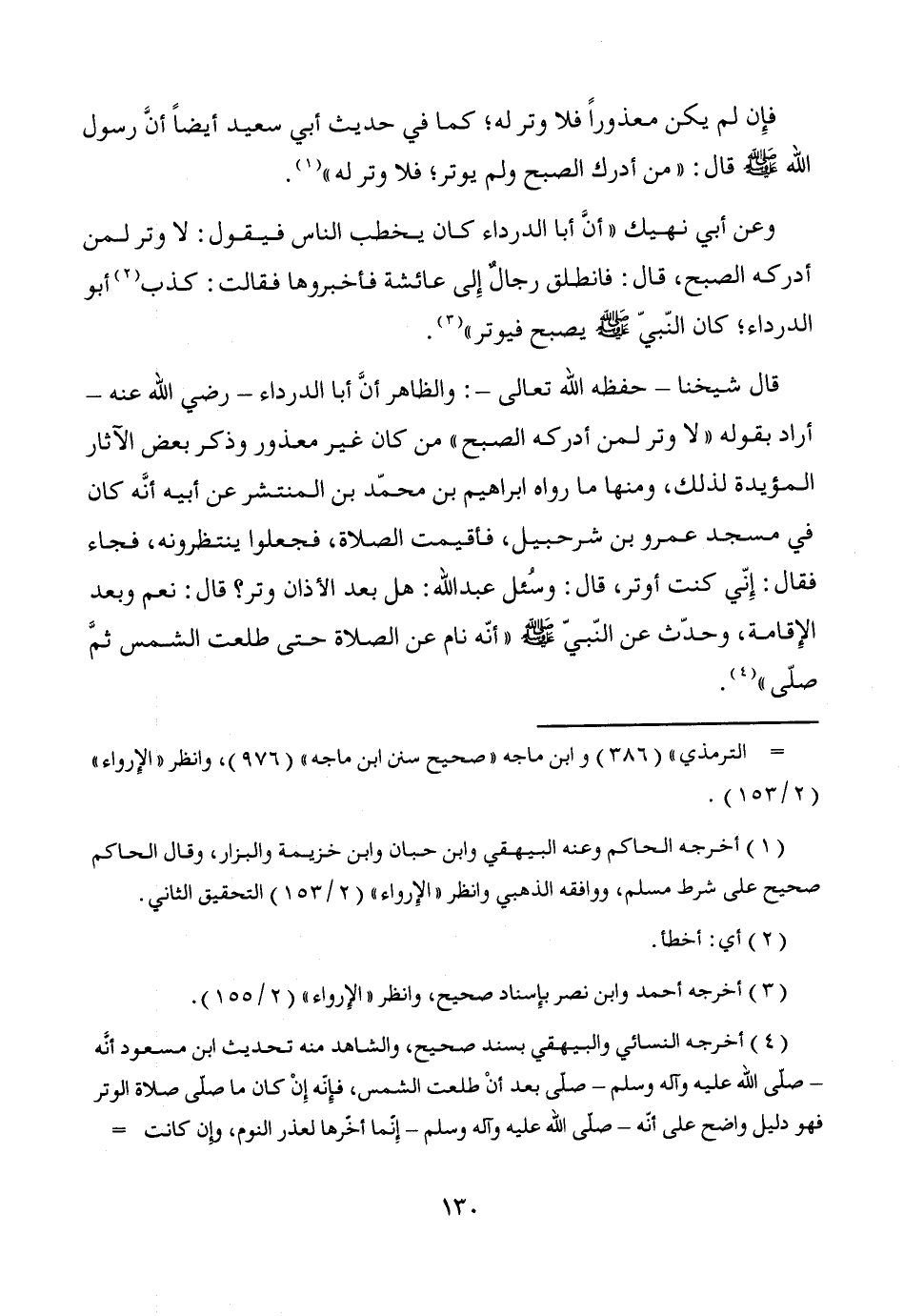(¬4) أخرجه النسائي والبيهقي بسند صحيح، والشاهد منه تحديث ابن مسعود أنه - صلى الله عليه وآله وسلم- صلى بعد أنْ طلعت الشمس، فإِنّه إِنْ كان ما صلى صلاة الوتر فهو دليل واضح على أنه- صلى الله عليه وآله وسلم- إِنما أخّرها لعذر النوم، وإن كانت =