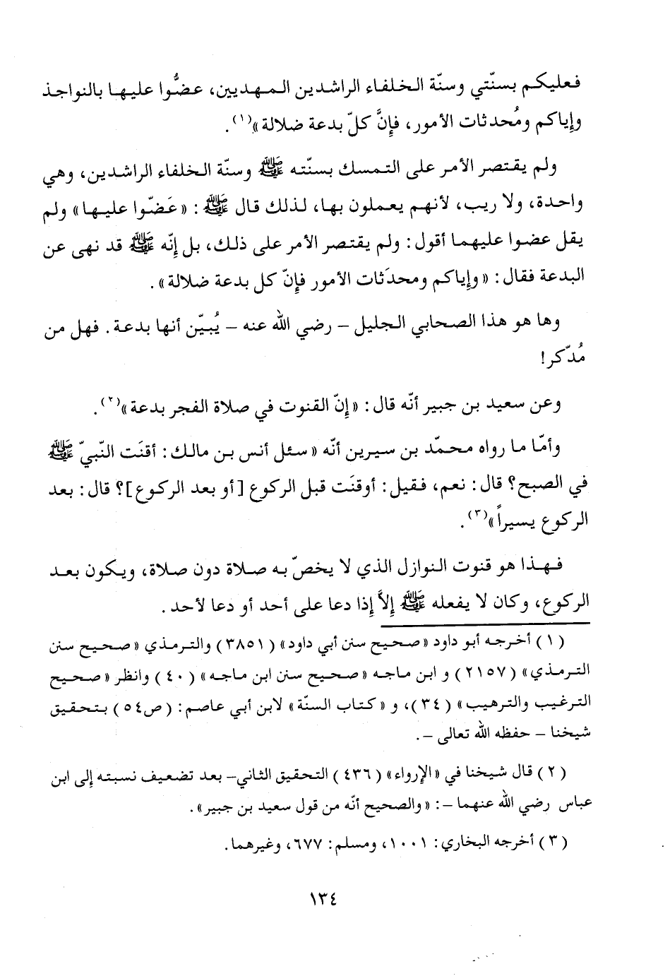 ولم يقتصر الأمر على التمسك بسنّته - صَلَّى اللَّهُ عَلَيْهِ وَسَلَّمَ - وسنّة الخلفاء الراشدين، وهي واحدة، ولا ريب، لأنهم يعملون بها، لذلك قال - صَلَّى اللَّهُ عَلَيْهِ وَسَلَّمَ -: "عَضّوا عليها" ولم يقل عضوا عليهما أقول: ولم يقتصر الأمر على ذلك، بل إِنّه - صَلَّى اللَّهُ عَلَيْهِ وَسَلَّمَ - قد نهى عن البدعة فقال: "وإِياكم ومحدَثات الأمور فإِنّ كل بدعة ضلالة".