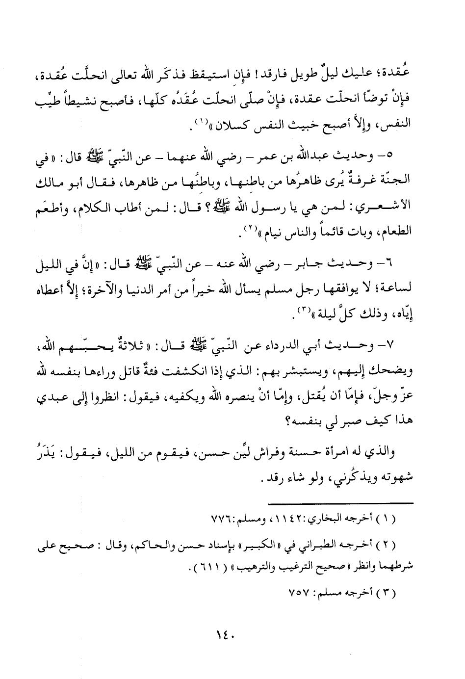 5 - وحديث عبد الله بن عمر -رضي الله عنهما- عن النّبيّ - صَلَّى اللَّهُ عَلَيْهِ وَسَلَّمَ - قال: "في الجنّة غرفةٌ يُرى ظاهرها من باطِنها، وباطِنُها من ظاهرها، فقال أبو مالك الأشعري: لمن هي يا رسول الله - صَلَّى اللَّهُ عَلَيْهِ وَسَلَّمَ -؟ قال: لمن أطاب الكلام، وأطعَم الطعام، وبات قائماً والناس نيام" (¬2).