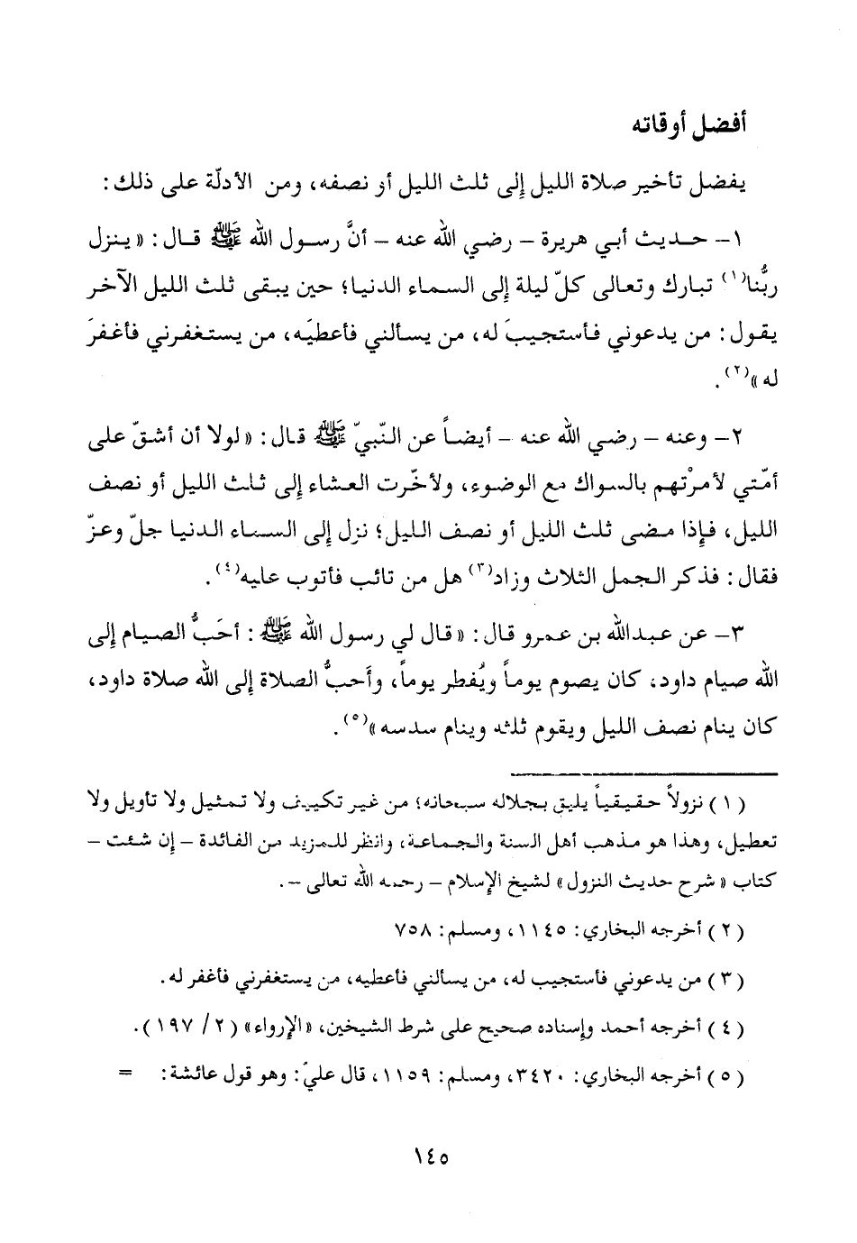 3 - عن عبد الله بن عمرو قال: "قال لي رسول الله - صَلَّى اللَّهُ عَلَيْهِ وَسَلَّمَ -: أحَبُّ الصيام إِلى الله صيام داود، كان يصوم يوماً ويُفطر يوماً، وأحبُّ الصلاة إلى الله صلاة داود، كان ينام نصف الليل ويقوم ثلثه وينام سدسه" (¬5).