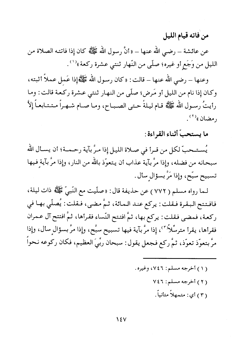 يُستحبّ لكل من قرأ في صلاة الليل إِذا مرَّ بآية رحمة؛ أن يسأل الله سبحانه من فضله، وإِذا مرَّ بآية عذاب أن يتعوّذ بالله من النار، وإذا مرَّ بآيةٍ فيها تسبيح سبّح، وإذا مَرَّ بسؤالٍ سأل.