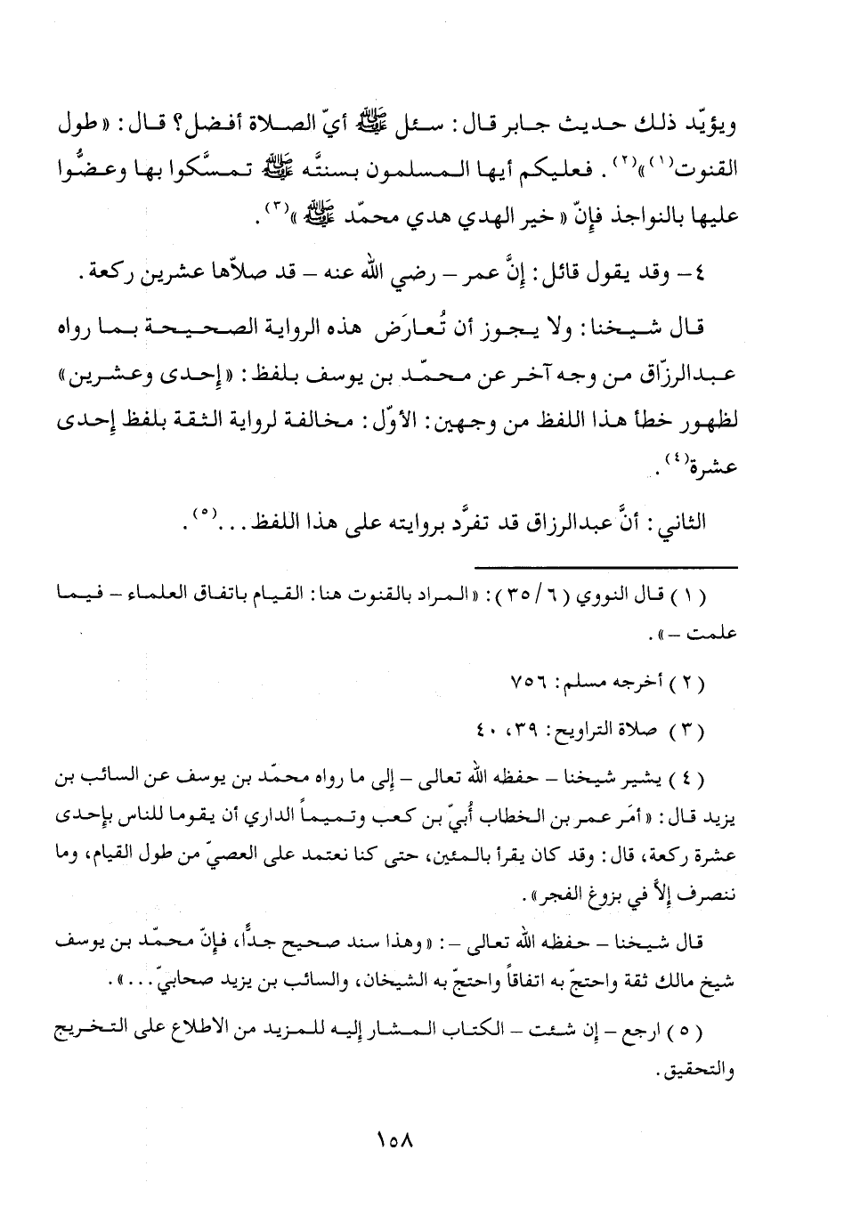 (¬4) يشير شيخنا -حفظه الله تعالى- إِلى ما رواه محمّد بن يوسف عن السائب بن يزيد قال: "أمَر عمر بن الخطاب أُبيّ بن كعب وتميماً الداري أن يقوما للناس بإِحدى عشرة ركعة، قال: وقد كان يقرأ بالمئين، حتى كنا نعتمد على العصيّ من طول القيام، وما ننصرف إلاَّ في بزوغ الفجر".